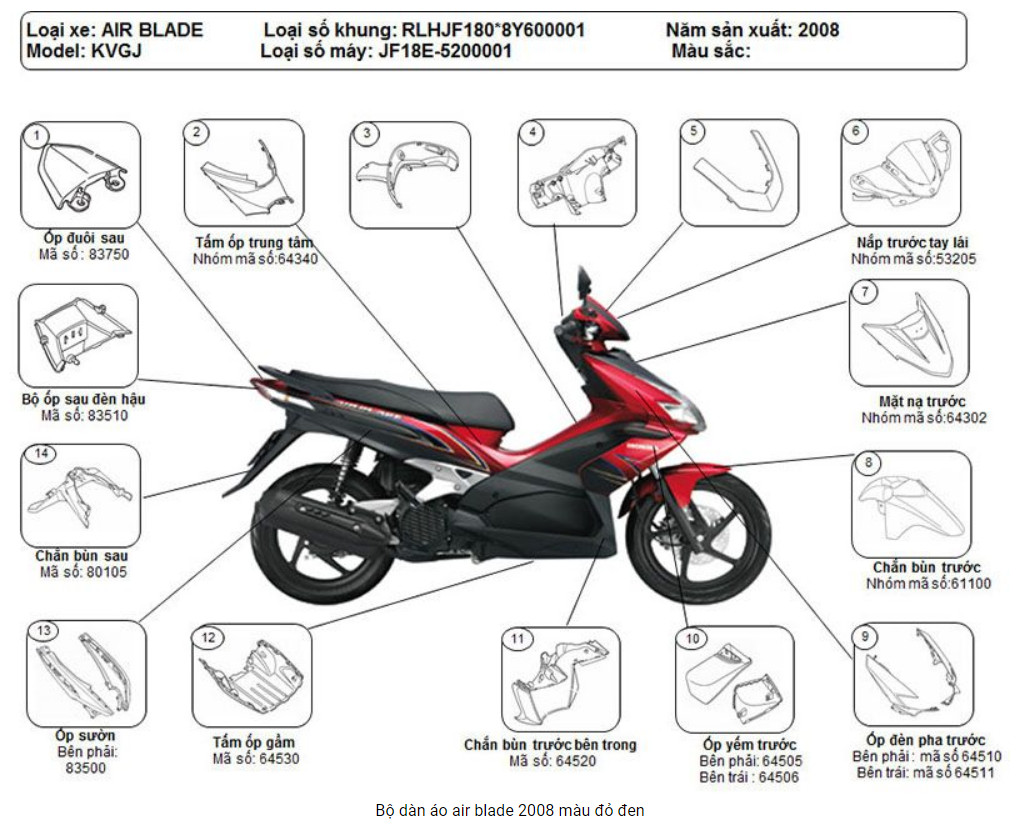 Bộ nhựa đầy đủ gồm 32 chi tiết, có cả nhựa màu và nhựa sần, không bao gồm các cụm đèn tín hiệu và đèn chiếu sáng. Giá dàn áo của xe máy Honda Airblade 2008 cụ thể như sau